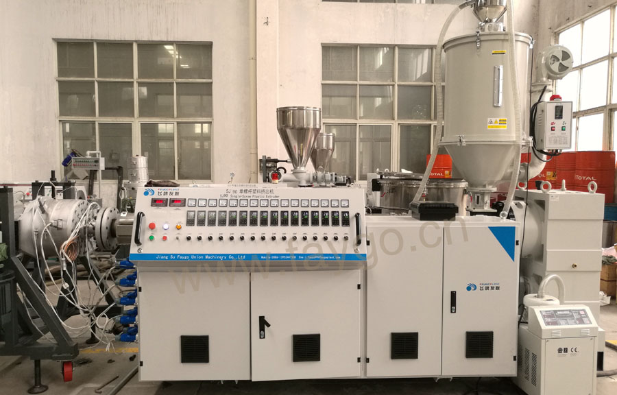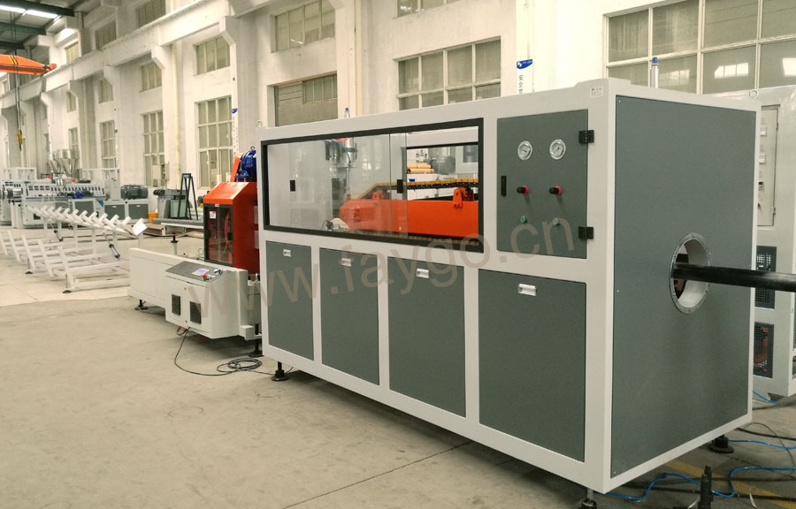 模具和辅机:机头采用新式的篮式机头或螺旋分流式挤管复合机头,具有调节方便,出料均匀的特点,定径套采用开槽工艺和水环冷却,确保管材的成型精度。辅机方面,采用真空定径技术和喷淋冷却水槽,提高管材的成品率,满足高速生产的需要。对于中大口径的管材,采用多履带牵引机,牵引力均匀平稳,履带由交流变频电机带动,并由节能的变频器驱动,实现了准确的速度调节,与挤出过程达到高度的同步。采用高速、准确设计的切割机,切割断面平整。